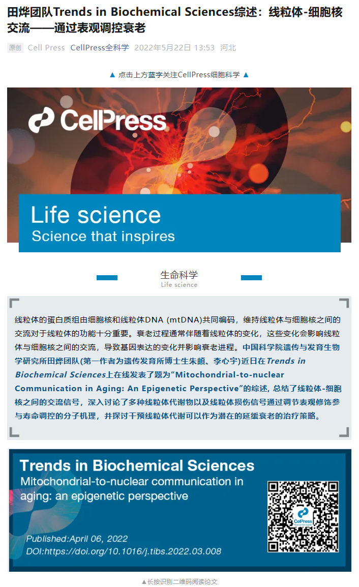 【CellPress全科学】田烨团队Trends in Biochemical Sciences综述:线粒体-细胞核交流——通过表观调控衰老