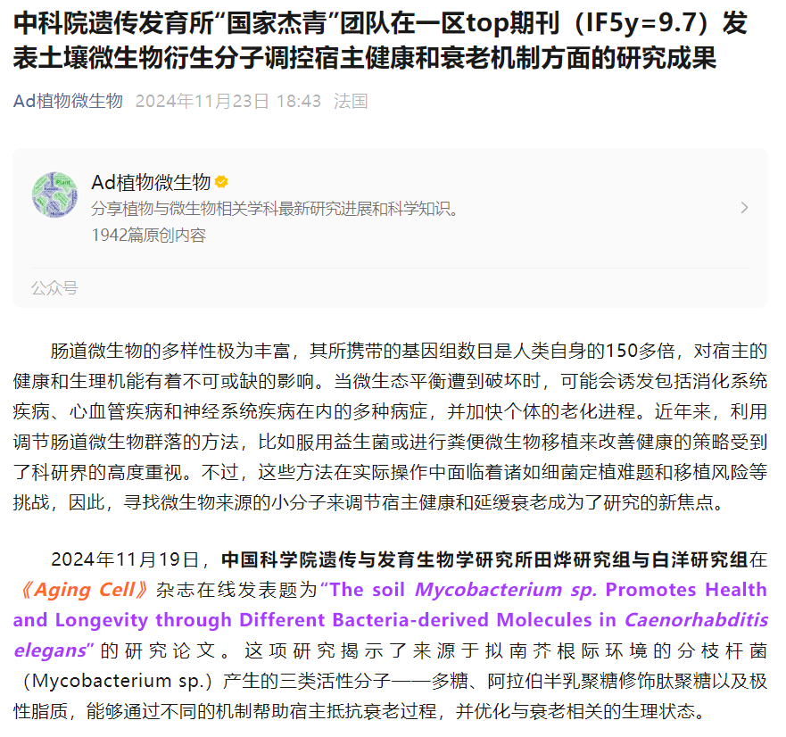 【Ad植物微生物】中科院遗传发育所“国家杰青”团队在一区top期刊(IF5y=9.7)发表土壤微生物衍生分子调控宿主健康和衰老机制方面的研究成果