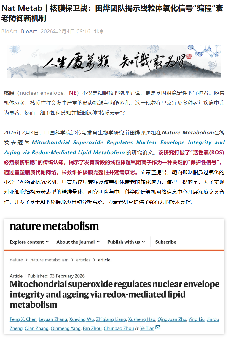 【BioArt】Nat Metab丨核膜保卫战:田烨团队揭示线粒体氧化信号“编程”衰老防御新机制